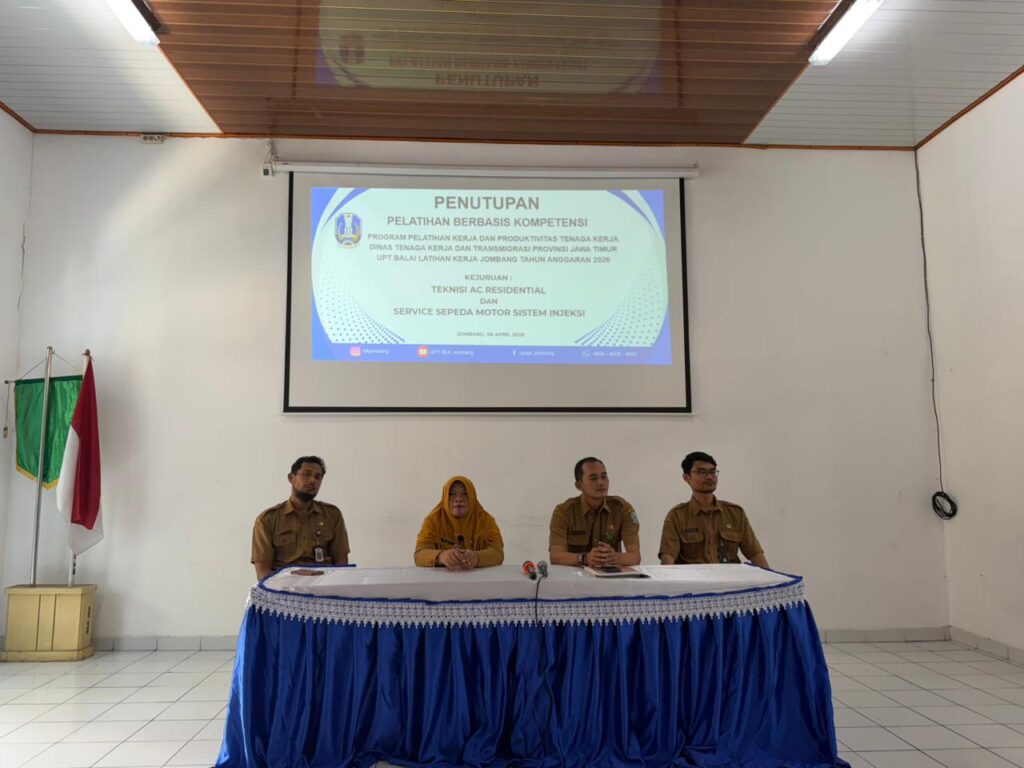 Jombang.UPT Balai Latihan Kerja (BLK) Jombang secara resmi menutup rangkaian Pelatihan Berbasis Kompetensi (PBK) Angkatan 2 Tahun Anggaran 2026. Acara penutupan ini berlangsung dengan khidmat di Aula Mini UPT BLK Jombang pada Senin, (6/4/2026).